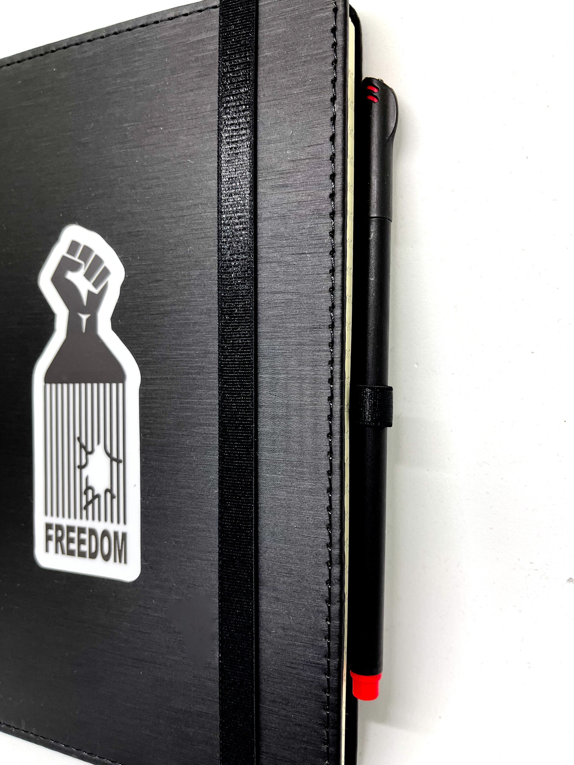 Zwarte notebook 14,5 X 21cm, met Freedom logo (gelinieerd)+ fijnschrijver in een verrassings kleurBlack notebook 14,5 X 21cm, with Freedom logo (lined pages)+ a surprise color fineliner
